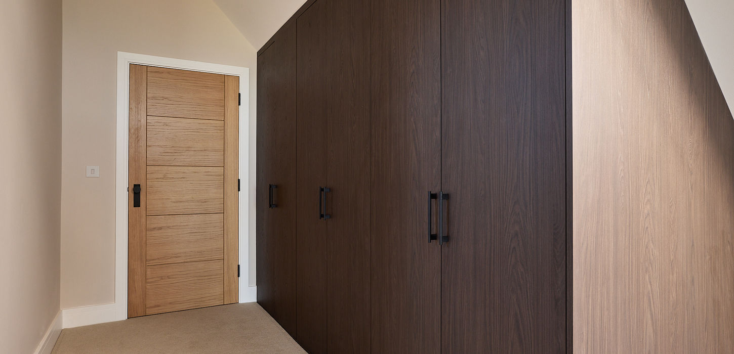 Fitted wardrobes and dressing areas were also supplied for each home, specified in Linden Marone Casella Oak. Matt black handles provide a crisp contrast against the timber finish, while adjustable shelving and hanging space ensure flexibility for future occupants. Integrated desks further enhance the usability of these spaces, supporting home working and study within the wider residential scheme