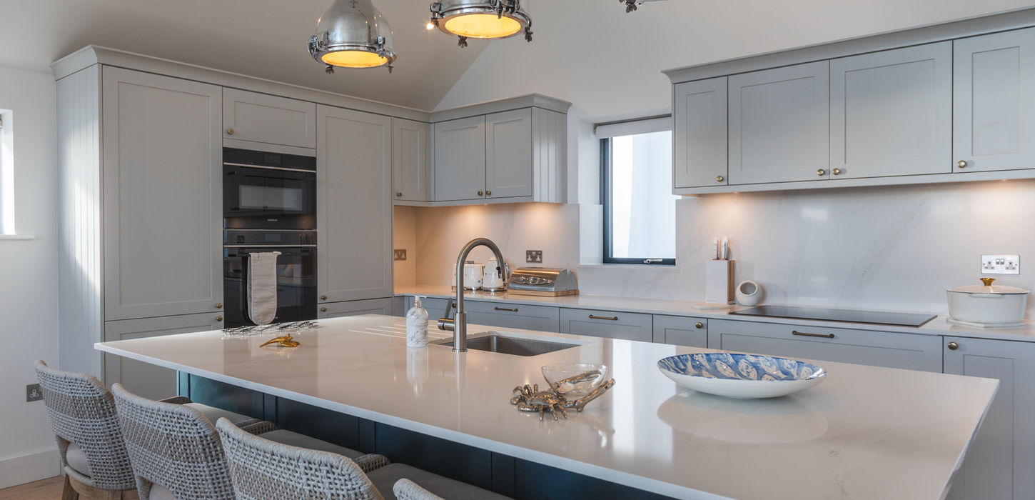 A third apartment channels coastal inspiration, featuring Veryan Marine and Light Grey cabinetry with a Marine-toned utility that includes tongue and groove panelling for added texture. Silestone Calacatta Gold Quartz worktops bring a touch of luxury complemented by Siemens appliances and finished with Coombe Painted White wardrobes for a calm and refined atmosphere.